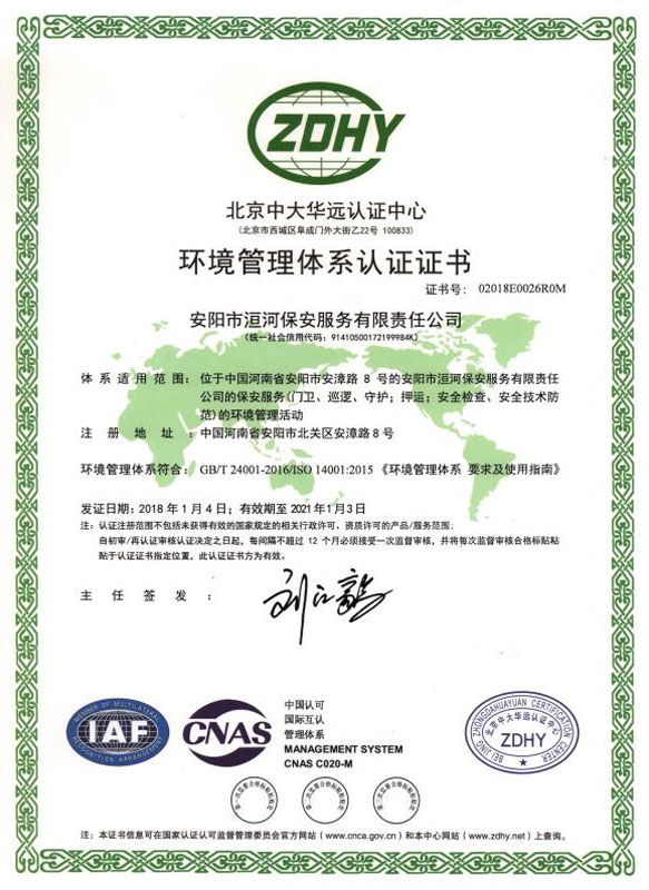 環(huán)境管理體系認(rèn)證證書