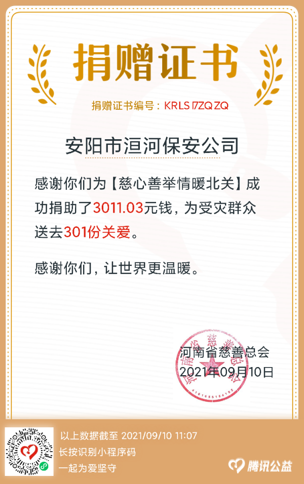 公司黨委書記王高峰及全體黨委委員帶頭在網(wǎng)上進(jìn)行募捐,全體干部職工積極響應(yīng),紛紛拿出手機(jī),通過(guò)掃碼的形式積極參與募捐活動(dòng),并將該項(xiàng)目轉(zhuǎn)發(fā)至朋友圈、微信群,擴(kuò)大活動(dòng)影響力,動(dòng)員更多的群眾參與捐款。據(jù)統(tǒng)計(jì),9月7日-9月9日三天時(shí)間公司共累計(jì)網(wǎng)絡(luò)捐款3011.03元。
