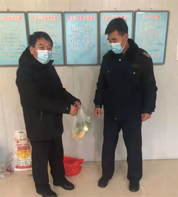 1月10日,因?yàn)橐咔榉揽?,公?wù)倉(cāng)的兩名隊(duì)員被隔離在崗位上。中隊(duì)長(zhǎng)程永明得知情況后很是擔(dān)心隊(duì)員們的生活,害怕隊(duì)員們?nèi)甜嚢ゐI,于是他連夜從家中拿些生活用品送到公務(wù)倉(cāng)崗點(diǎn)隊(duì)員手中,囑咐他們安心工作。隨后的日子里程永明定時(shí)把生活用品送到崗點(diǎn),隊(duì)員們看到領(lǐng)導(dǎo)的關(guān)心,非常感動(dòng),他們表示讓分公司領(lǐng)導(dǎo)放心,一定保護(hù)好客戶的財(cái)產(chǎn)安全。