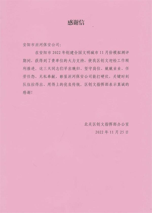 此次,志愿者們?cè)诜?wù)中增強(qiáng)了社會(huì)責(zé)任感,以實(shí)際行動(dòng)圓滿完成了我市文明城市創(chuàng)建任務(wù),同時(shí)北關(guān)區(qū)創(chuàng)文指揮部發(fā)來表揚(yáng)信,表揚(yáng)公司在安陽市創(chuàng)文模擬測(cè)評(píng)期間做出的貢獻(xiàn)。彰顯了洹河保安公司能打硬仗,關(guān)鍵時(shí)刻隊(duì)伍拉得出、用得上的優(yōu)良傳統(tǒng),展示了洹河保安公司作為新創(chuàng)省級(jí)文明單位的責(zé)任擔(dān)當(dāng)和奉獻(xiàn)精神。