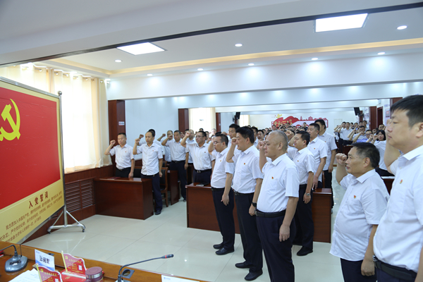 接著,在王高峰同志帶領下,面向鮮紅的中國共產黨黨旗,18名新黨員舉起右拳、莊嚴宣誓,許下錚錚誓言。全體老黨員一同重溫入黨誓詞,齊憶初心使命。