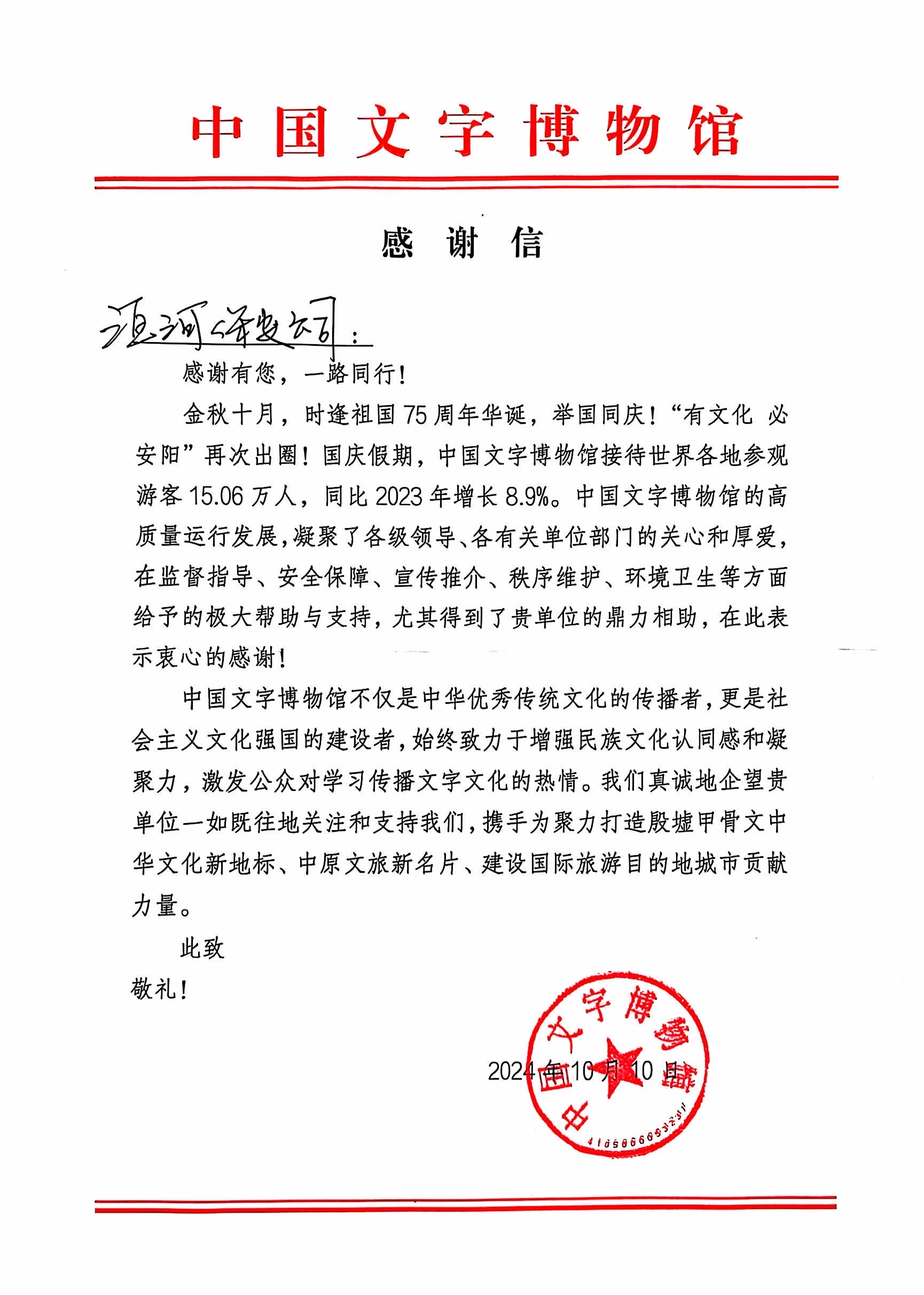10月12日,中國文字博物館安全保衛(wèi)部主任孫琳杰專程來到我公司,送來一封感謝信,以此感謝今年國慶期間公司在安全保衛(wèi)工作中所付出的努力和作出的貢獻(xiàn)。此次國慶期間,中國文字博物館接待世界各地參觀游客15.06萬人次,參觀人數(shù)多、時(shí)間長(zhǎng)、影響面廣,公司全體保安員盡職盡責(zé),嚴(yán)格落實(shí)各項(xiàng)安保措施,以飽滿的熱情和敬業(yè)的工作態(tài)度,為博物館安全作出了積極貢獻(xiàn)。