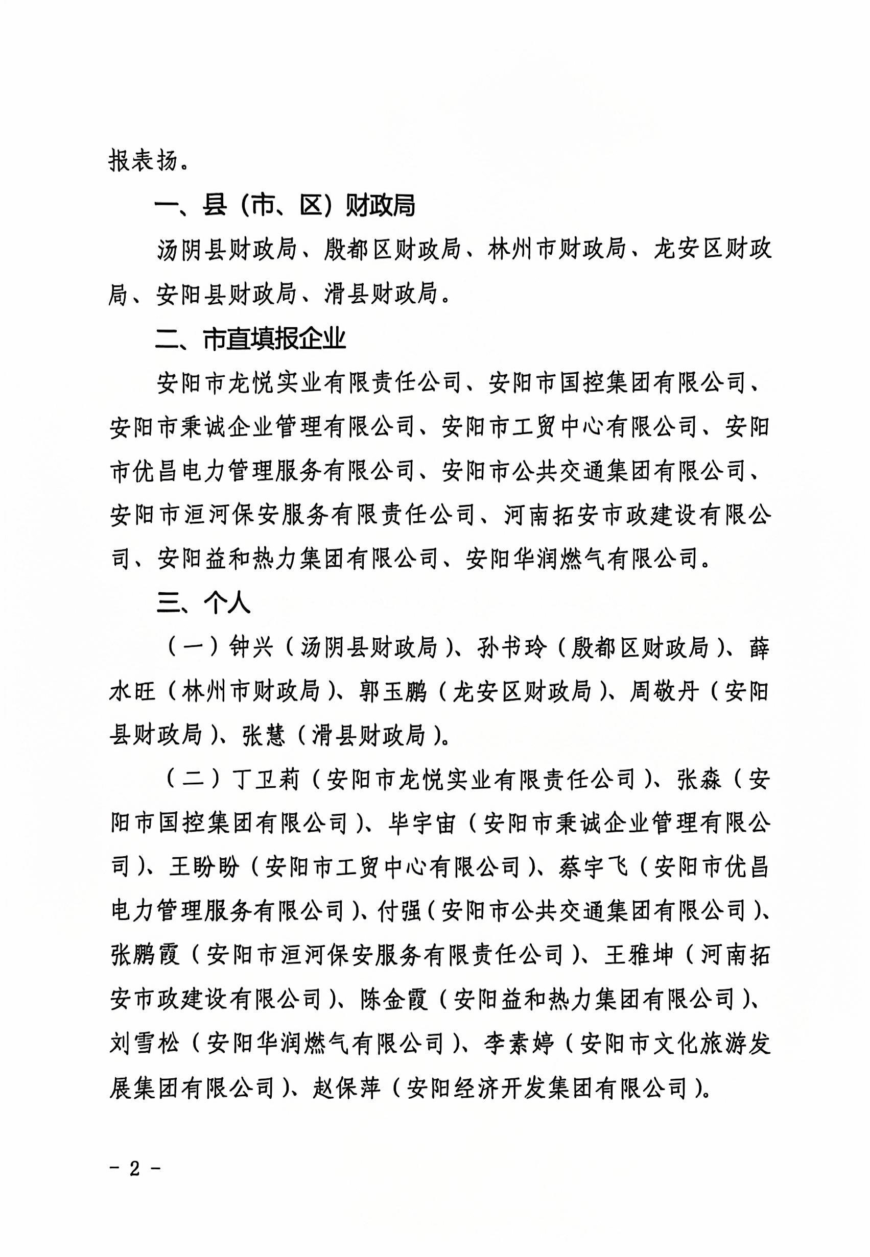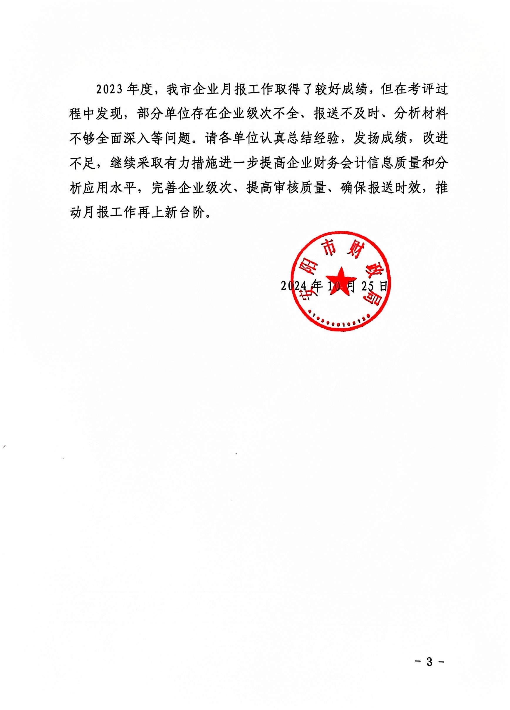 10月25日,安陽市財政局印發(fā)《關(guān)于2023年度企業(yè)經(jīng)濟(jì)效益月報工作的通報》(安財企〔2024〕5號),經(jīng)安陽市財政局綜合考評,洹河保安公司2023年度經(jīng)濟(jì)效益月報工作及財務(wù)部副主任張鵬霞同志,被通報表揚(yáng)。