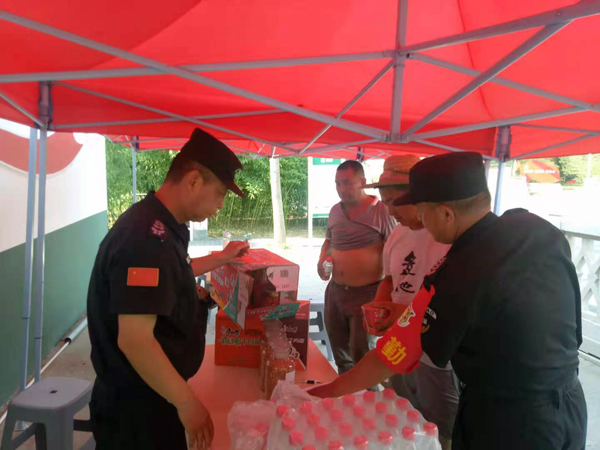 由于高溫干旱,防火成為糧庫的首要工作。保安員犧牲休息時間配合中儲糧,聯(lián)合公安、消防等部門開展消防安全大檢查并開展消防安全演練,增強了消防安全意識,提升了消防滅火能力。為確保出入糧庫車輛有序、安全,隊員每天早來晚歸,維護糧庫大門口秩序。看到糧農(nóng)排隊售糧,保安班長馮秋森安排隊員架設(shè)愛心涼亭,擺放愛心座椅, 備足熱水、礦泉水等防暑降溫用品,讓糧農(nóng)使用,防止中暑。他們又準(zhǔn)備了方便面分發(fā)到糧農(nóng)手中,解決他們的用餐。