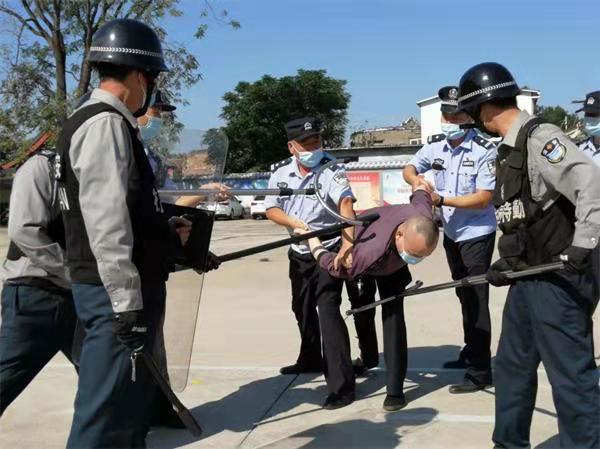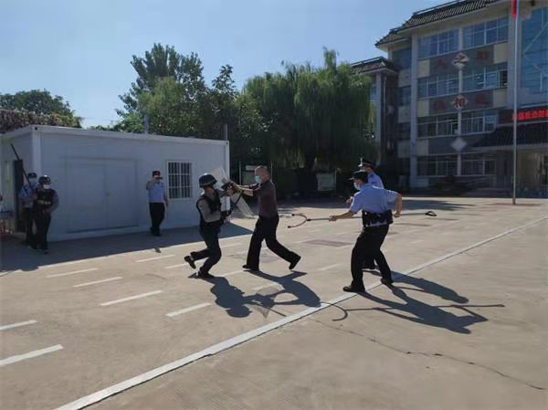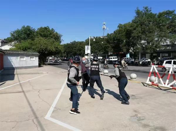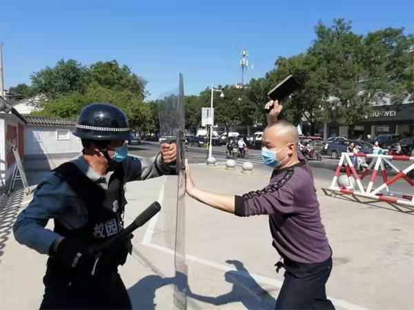 一名“恐暴”分子到學(xué)校門崗尋釁滋事,與門崗保安隊(duì)員發(fā)生沖突,暴徒手持菜刀闖進(jìn)校園。學(xué)校兩名保安手持鋼叉、盾牌與恐暴分子發(fā)生對峙,另一名保安按響了一健報(bào)警裝置,110指揮中心接到報(bào)警后,立即出動警力趕赴現(xiàn)場,學(xué)校保安和民警協(xié)同作戰(zhàn),成功將闖入校園的暴恐“歹徒”制服。整個(gè)演練過程緊湊、嚴(yán)肅逼真,受到了學(xué)校和派出所領(lǐng)導(dǎo)的表揚(yáng)。