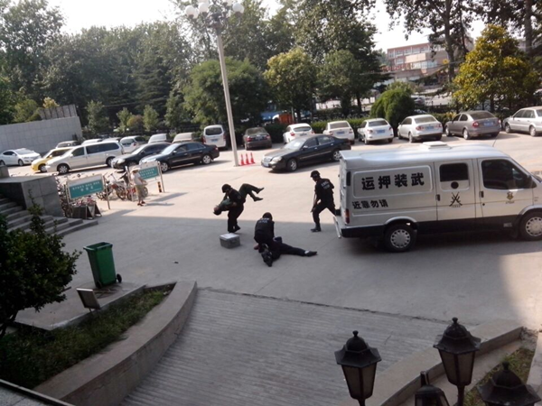 10月15日,守押二大隊(duì)在農(nóng)業(yè)銀行安陽(yáng)市行院內(nèi)開(kāi)展了一次暴恐突發(fā)事件應(yīng)急演練暨消防安全培訓(xùn)。本次演練共設(shè)置兩個(gè)科目分別為:遭遇持械搶劫運(yùn)鈔車(chē)事件處置演練、消防器材實(shí)操及現(xiàn)場(chǎng)滅火應(yīng)急預(yù)案演練。