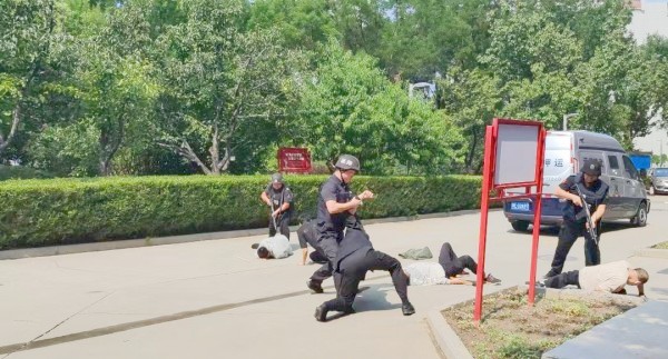 演練內(nèi)容以5名不法分子企圖在銀行網(wǎng)點(diǎn)門口乘押款員裝卸款箱時(shí)進(jìn)行搶奪款箱為背景,開(kāi)展防盜搶預(yù)案演練。面對(duì)歹徒,車組人員各司其職,快速反應(yīng),駕駛員立即向駐地隊(duì)長(zhǎng)報(bào)告,大隊(duì)長(zhǎng)迅速下達(dá)啟動(dòng)應(yīng)急預(yù)案的指令,并向銀行保衛(wèi)部門報(bào)告;同時(shí)守押隊(duì)員毫不畏懼,迅速行動(dòng)控制歹徒,確保人員及款箱安全。