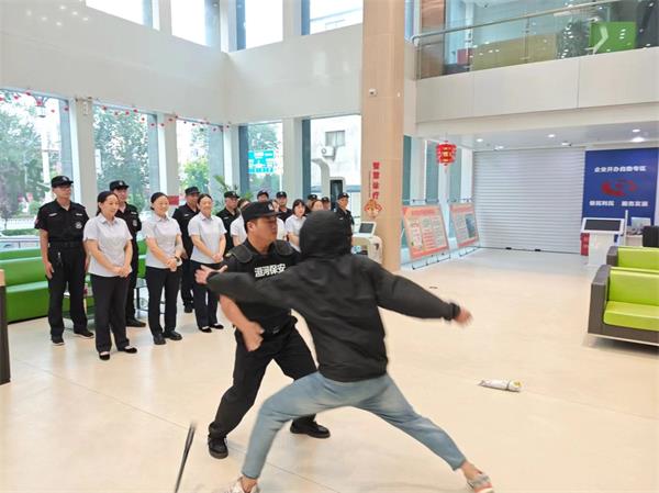7 月 11 日下午,為進(jìn)一步強化銀行安全保衛(wèi)工作,提升保安人員應(yīng)急處置能力,人防五大隊駐內(nèi)黃聯(lián)社中隊組織開展了一場別開生面的銀行大堂保安防搶劫演練。