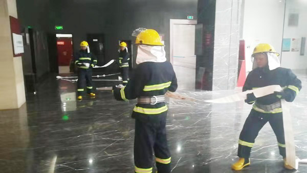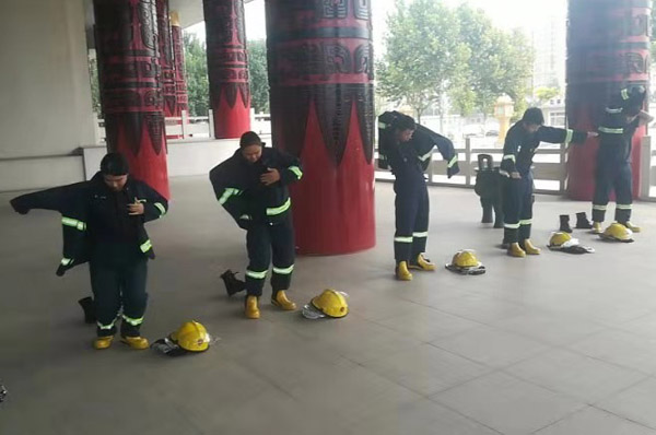中隊(duì)隊(duì)員在每日消防訓(xùn)練前,在中隊(duì)長(zhǎng)的帶領(lǐng)下認(rèn)真學(xué)習(xí)消防安全知識(shí),滅火器和消火栓等消防器材的使用方法,以及火災(zāi)發(fā)生時(shí)的應(yīng)急措施。中隊(duì)理論與實(shí)踐相結(jié)合,提高隊(duì)員的實(shí)際處置火險(xiǎn)能力,組織隊(duì)員開展初起火災(zāi)的撲救、自我安全保護(hù)、組織人員疏散、消防設(shè)施和器材的操作等訓(xùn)練。訓(xùn)練中,特保隊(duì)員發(fā)現(xiàn)火情后,立即啟動(dòng)火災(zāi)應(yīng)急處置方案,有的隊(duì)員迅速穿上消防服裝,觀察樓層火情,隔離起火設(shè)備,有的連接消防栓,打開滅火器撲滅火險(xiǎn)。
