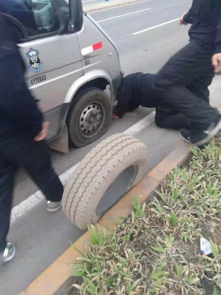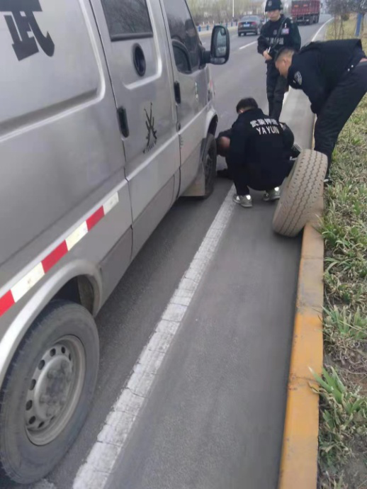 3月10日下午,守押七大隊聯(lián)社中隊橫水線路押運車輛豫EEA030行駛途中輪胎受損,導致車輛行駛異常。車長苗榮斌感覺異樣,立即叫停,安排司機原艷兵下車檢查,發(fā)現(xiàn)車輛右前輪胎發(fā)生漏氣,馬上就要癟掉。得知車況后,苗榮斌立即大隊領導上報情況。大隊指示,在安全的情況下更換車輛備胎,并同時上報了公司監(jiān)控中心。