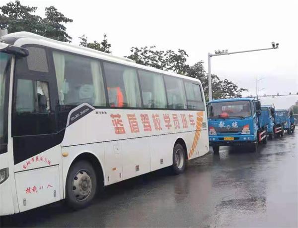 7月21日上午10時,藍(lán)盾駕校接到北關(guān)區(qū)政府指令后,立即組織學(xué)??购閾岆U應(yīng)急隊30名員工、3輛貨車、1輛大巴車,迅速趕到平原橋南側(cè)集合待命。
