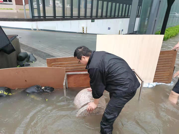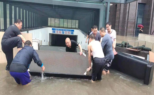 負(fù)一層這時候水已經(jīng)淹到了膝蓋處;由于配電室被淹導(dǎo)致停電,李艷軍大隊長馬上摸黑帶領(lǐng)隊員裝沙袋,找擋板,蹚著近腰高的深水堵截洪水。背沙袋、拖沙袋、拉沙袋,隊員們一路小跑,不管用什么辦法,爭分奪秒,搶險第一,戰(zhàn)勝洪水。