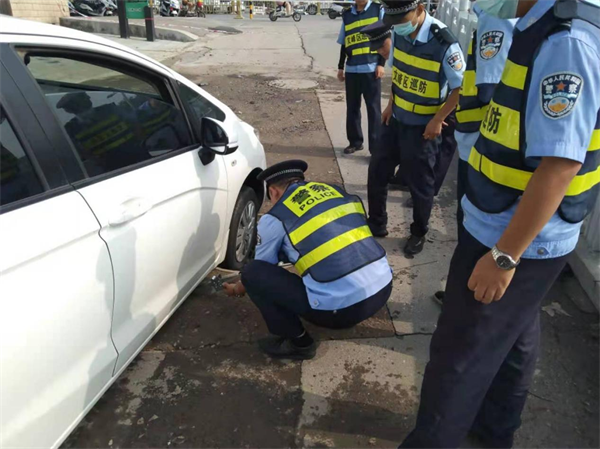 7月24日上午9時(shí)許,隊(duì)員楊科、李思聰、石玉濤等人,巡邏至文峰路西營街交叉口時(shí),發(fā)現(xiàn)一輛白色轎車的右前輪陷在窨井里,趕忙上前查看情況,應(yīng)是前幾日暴雨把窨井蓋給沖走了,導(dǎo)致車輛右輪卡在了窨井口。隨后,隊(duì)員們有的協(xié)助車主張女士,使用千斤頂把車輛頂起,有的在附近尋找被雨水沖走的窨井蓋。隊(duì)員們把找到井蓋放回原位,幫助車主安全離開,車主張女士一再表示感謝。