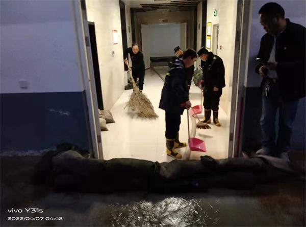 4月6日晚上十一點(diǎn),人防一大隊(duì)駐聯(lián)通公司東區(qū)崗點(diǎn)中、夜班的隊(duì)員交接完工作之后,夜班值班隊(duì)員杜懷濤、孟慶春開始接班后的正常巡樓工作。當(dāng)他們巡邏到負(fù)二層時(shí),聽到有水流的聲音,職業(yè)的敏感提醒他們,有管道跑水,順著流水的聲音巡去,果不其然,負(fù)二層中央空調(diào)系統(tǒng)供水管道破裂,管道里的水不停向外噴射,如果不及時(shí)處置,會引發(fā)負(fù)二層注水,給客戶造成財(cái)產(chǎn)損失。兩位值班隊(duì)員馬上通知監(jiān)控中心和值班班長,值班班長邱文濤接到報(bào)警后迅速向中隊(duì)長董紅衛(wèi)匯報(bào)情況,同時(shí)安排夜班同志到現(xiàn)場處理積水,董紅衛(wèi)趕赴現(xiàn)場后和值班隊(duì)員一起配合專業(yè)的維修人員處置險(xiǎn)情,經(jīng)過近五個(gè)小時(shí)的奮戰(zhàn),險(xiǎn)情得到妥善解決。