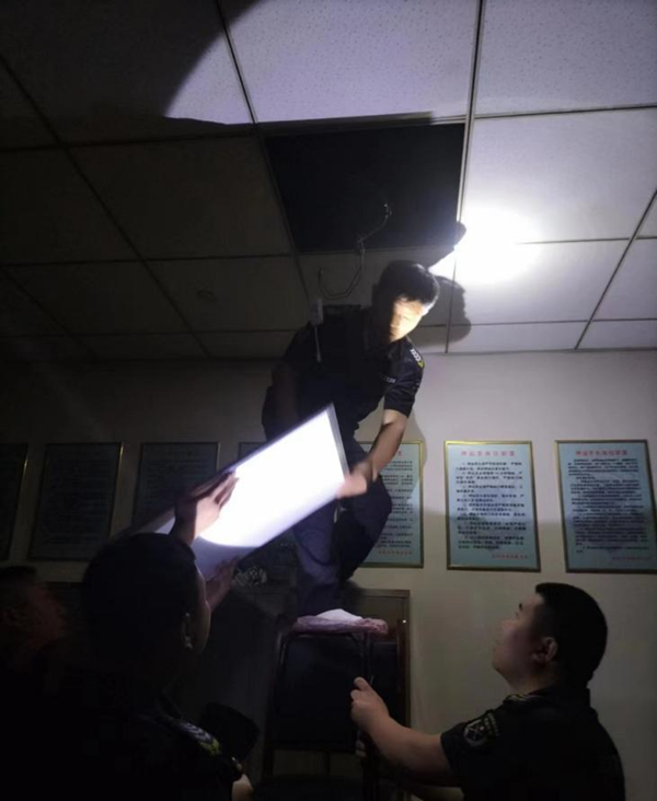 等候期間,監(jiān)控室隊員王文生去衛(wèi)生間,發(fā)現(xiàn)大家都在走廊站著,辦公室里漆黑一片。了解情況后,王文生默默地回到監(jiān)控室拿出自己常備的維修工具,上樓對吊頂燈進行了拆卸,排查熄燈原因。盡管屋里悶熱無光,但王文生憑借多年的工作經(jīng)驗,僅用幾分鐘就完成了維修。在大家的等待中,突然傳來了王文生的聲音“送上電咱試一下?!?