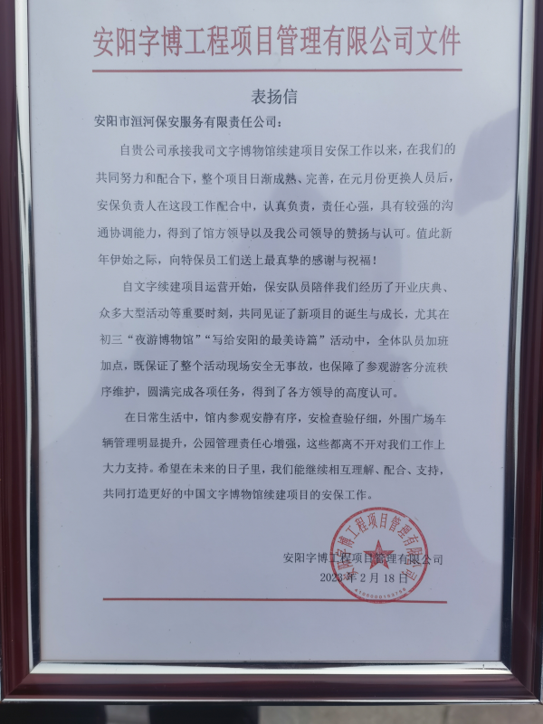 表揚信中寫道,自文字續(xù)建項目運營開始,公司駐點全體安保隊員認真負責,盡心盡力做好文字博物館的安保及外圍公園管理治安秩序維護工作。尤其是在大型活動期間,全體安保人員履職盡責,堅持安全第一,既保證了活動現(xiàn)場安全無事故,也保障了參觀游客分流秩序維護,圓滿完成各項任務,得到各方領(lǐng)導的高度認可。