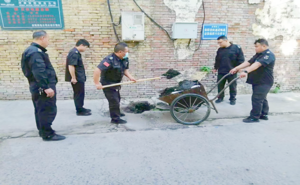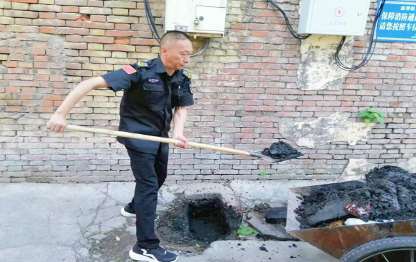 董偉得知情況后,立即組織隊(duì)員趕往現(xiàn)場(chǎng)進(jìn)行查看,經(jīng)排查發(fā)現(xiàn)污水外溢是由后院下水道沉淀池堵塞,造成營(yíng)業(yè)廳污水難以排放。為徹底整治下水道堵塞這一“頑疾”,董偉安排水冶本地隊(duì)員從家里拿來(lái)鐵揪、手推車(chē)等工具,組織隊(duì)員對(duì)沉淀池進(jìn)行徹底清理。當(dāng)翻開(kāi)沉淀池窨井蓋時(shí),面對(duì)臭氣熏天的淤泥,隊(duì)員們沒(méi)有絲毫的退縮,頂著刺鼻的氣味,大家一起動(dòng)手,將堵塞的淤泥、樹(shù)葉、生活垃圾等集中用推車(chē)清運(yùn)拉走。下水道疏通后,隊(duì)員又提水把周?chē)廴镜穆访媲逑锤蓛?。下水道通了,路面也干凈了,大家的心情也舒暢了?