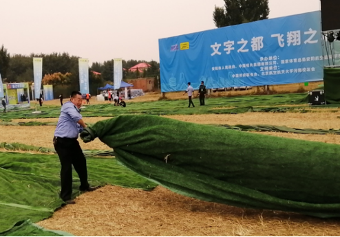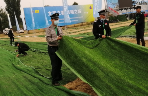 “把這邊拉整齊?!薄拔疫@里已經(jīng)鋪平了?!?月30日下午,第十二屆安陽(yáng)航空運(yùn)動(dòng)文化旅游節(jié)主會(huì)場(chǎng),在執(zhí)勤的公司保安員應(yīng)客戶要求忙著整理會(huì)場(chǎng)上草坪地毯。