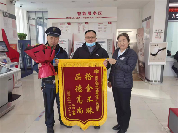 12月18日上午10時,人防四大隊駐安陽工商銀行朝霞路支行執(zhí)勤隊員吳波在協(xié)助網(wǎng)點清掃積雪中,發(fā)現(xiàn)客戶遺失路邊黑色書包一個,吳波立即上報營業(yè)網(wǎng)點值班領(lǐng)導(dǎo),經(jīng)銀行網(wǎng)點領(lǐng)導(dǎo)多方查找,終于聯(lián)系到遺失物品客戶王超。經(jīng)核實無誤后,將物品后交還客戶。客戶為感謝隊員吳波同志拾金不昧的精神,于12月20日上午到工行朝霞路支行送錦旗。