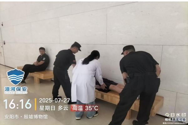 7月27日15:40,殷墟博物館特保大隊隊員王德爭與李亞偉在二樓日常巡邏時,發(fā)現(xiàn)一名五十多歲男游客面色異常,二人立即上前關(guān)切詢問,游客自述頭暈不適。王德爭第一時間通過對講機(jī)聯(lián)系一樓當(dāng)班班長王巖。王巖迅速響應(yīng),立即帶領(lǐng)醫(yī)護(hù)人員趕赴二樓現(xiàn)場。醫(yī)護(hù)人員到場后,當(dāng)即為游客測量血壓,發(fā)現(xiàn)其血壓高至170,經(jīng)進(jìn)一步細(xì)致檢查,確認(rèn)游客可能因低血糖導(dǎo)致,讓游客口服水果糖緩解,暫無緊急危險。處置期間,王德爭、李亞偉負(fù)責(zé)維護(hù)現(xiàn)場秩序,為救助工作的順利開展提供保障。隨后,王巖聯(lián)系到游客家屬。待家屬趕到后,特保隊員小心護(hù)送游客至東門出口,并貼心叮囑家屬陪同游客前往就近醫(yī)院做進(jìn)一步檢查。