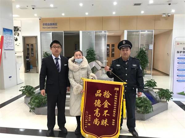 12月2日上午,李女士給中國建行中州路支行送來一面錦旗,激動(dòng)地對(duì)行長(zhǎng)說?!疤兄x你們了,如果不是建行保安大哥品德高尚,拾金不昧,我的損失就大了?!?