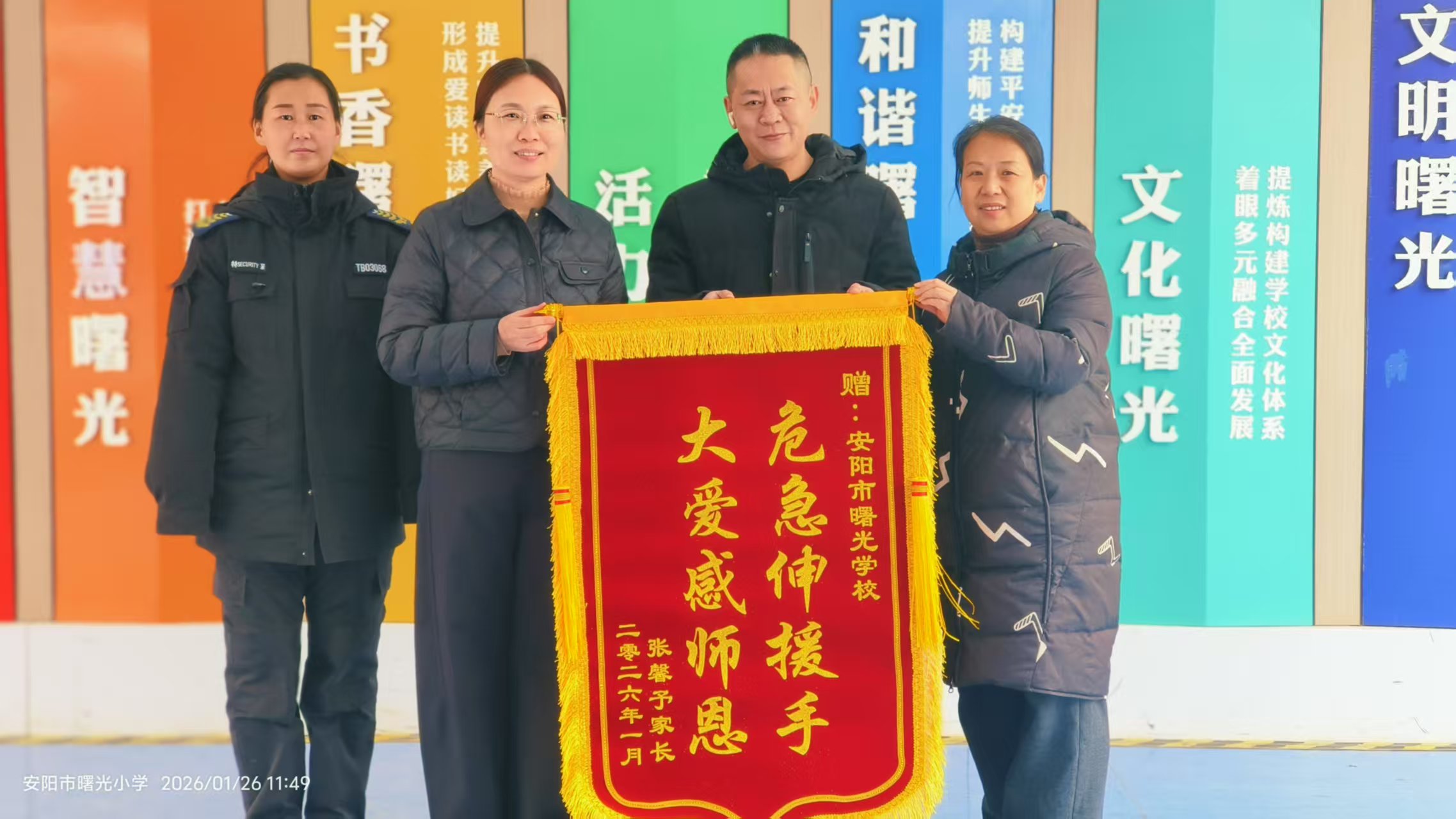 1月26日中午,一面滿載感激的錦旗被送至安陽(yáng)市曙光學(xué)校,老人家屬緊緊握住校領(lǐng)導(dǎo)的手連連致謝,感謝學(xué)校師生及人防五大隊(duì)駐校保安師娟的緊急施救,為老人挽回生命。這份謝意,源于1月23日中午校門(mén)口一場(chǎng)與死神賽跑的暖心救援。