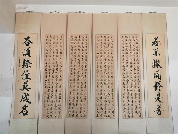 杜先生家大門朝東,坐落在村東一處較為平緩的崗地,頗具靜水流深、紫氣東來之神韻。這里儼然是一處天然氧吧,門前開闊地東側(cè),是一片蔥郁的樹林,林中不知名的鳥兒發(fā)出歡快的叫聲,好像和主人一起歡迎客人的到來。我們隨主人進(jìn)院來到北屋,一股書香氣撲面而來,正門墻上一組行書四扇屏字畫映入眼簾,上書孔子老先生教誨的九思,兩側(cè)是一副醒目的對(duì)聯(lián):若不撇開終是苦,各須捺住莫成名。