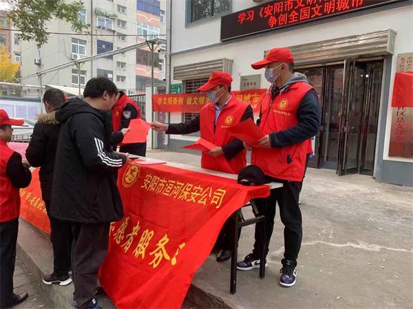 為切實(shí)發(fā)揮文明單位在文明創(chuàng)建工作中的示范引領(lǐng)作用,營(yíng)造全國(guó)文明城市創(chuàng)建氛圍,提高市民文明道德素質(zhì),根據(jù)《安陽(yáng)市文明行為促進(jìn)條例》宣傳貫徹以及“百萬(wàn)志愿者進(jìn)社區(qū)”有關(guān)活動(dòng)安排,11月27日下午,公司積極響應(yīng)市文明辦活動(dòng)號(hào)召,組織10余名志愿者到盤庚中社區(qū)開展了《條例》宣傳進(jìn)社區(qū)活動(dòng),通過(guò)文明勸導(dǎo)、示范引領(lǐng),引導(dǎo)和教育廣大市民養(yǎng)成良好的文明行為,營(yíng)造了文明禮讓的良好氛圍,樹立了安陽(yáng)市洹河保安公司市級(jí)文明單位的良好社會(huì)形象。